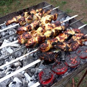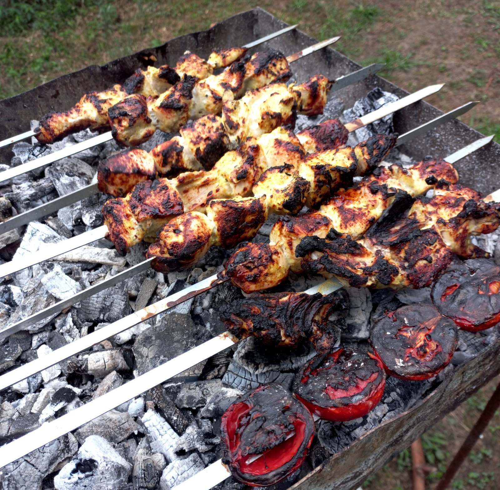 - Place the skewers on the preheated grill and cook for about 10-12 minutes, turning occasionally, until the chicken is cooked through and slightly charred on the outside.