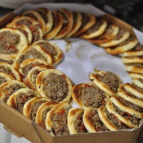 - Transfer the prepared Sfiha onto a baking sheet lined with parchment paper or a lightly greased baking dish.
