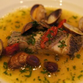 - Gently place the fish fillets and cleaned mussels into the pot, ensuring they are submerged in the broth. Cover the pot and let it simmer for about 10-15 minutes, or until the mussels have opened and the fish is cooked through.