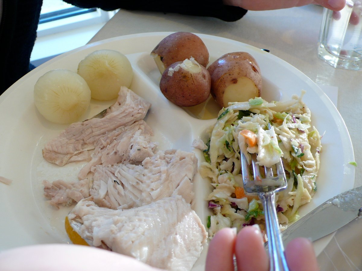 - Serve the fish, potatoes, and onions hot on a platter, and drizzle them with the melted butter.