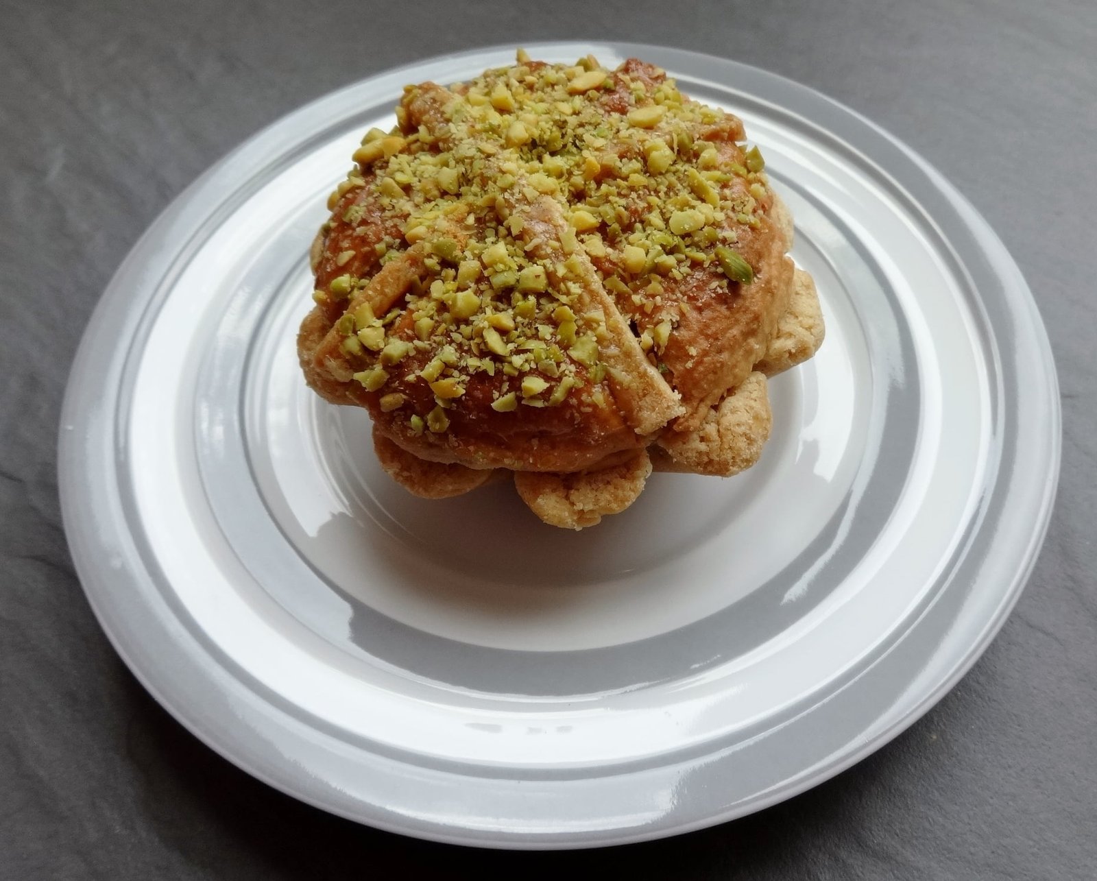 - Brush the tops of the pastries with more beaten egg and place a whole pistachio on top of each.