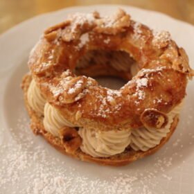 - Slice the pastry ring horizontally and fill with the praline cream. Replace the top of the pastry and dust with powdered sugar.