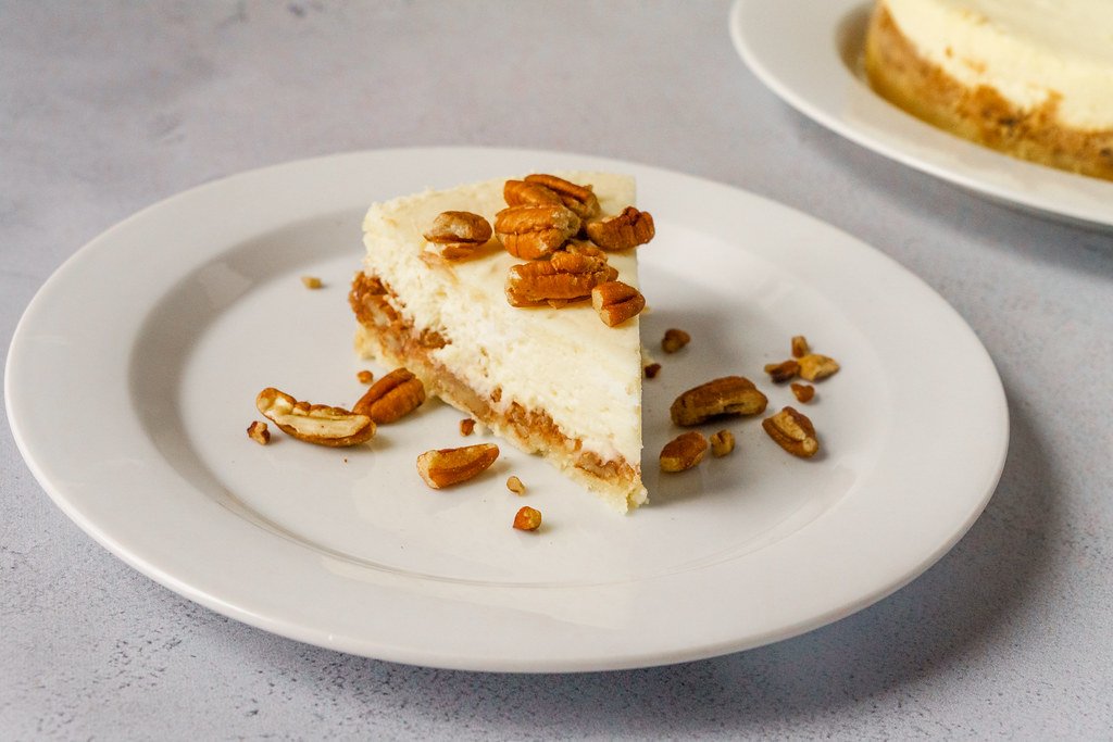- Spoon the pecan mixture over the cheesecake filling and spread it out.
