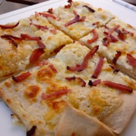 - Slice and serve your delicious Flammkuchen hot and enjoy!