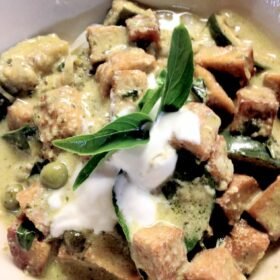 Green curry with fried tofu and rice noodles