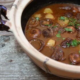 Claypot beef stew with potatoes and mushrooms