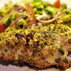 - Brush each chicken breast with olive oil, then coat them with the breadcrumb mixture, pressing gently to adhere.