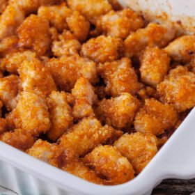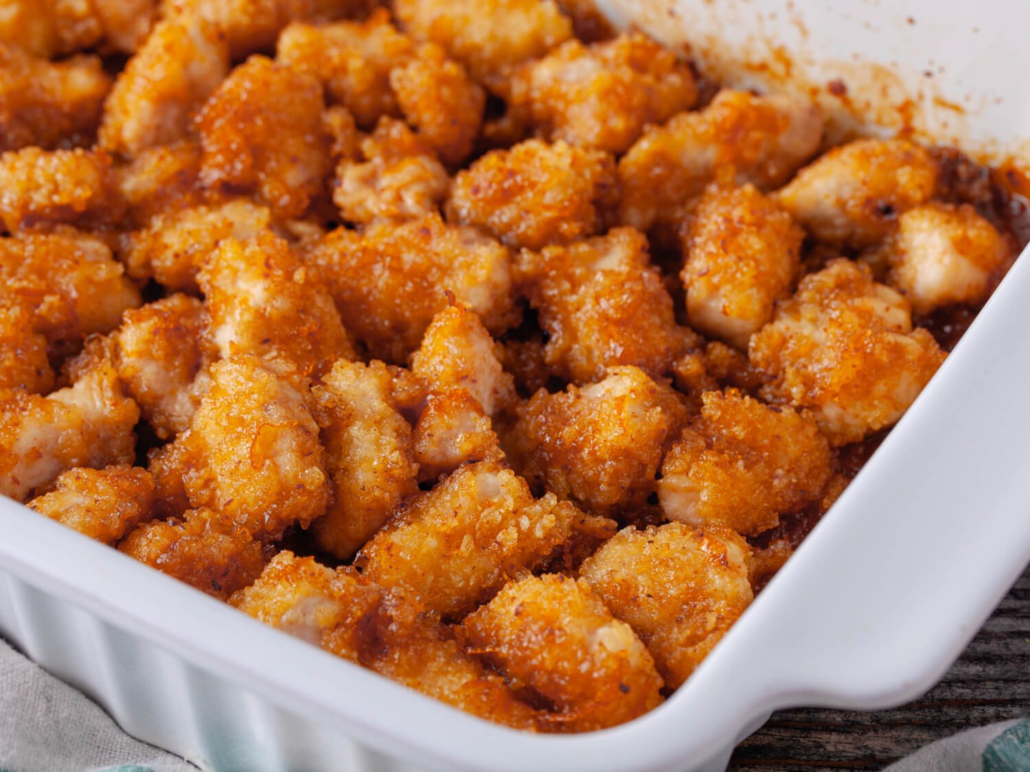 - Dredge each chicken piece into the cornstarch, then the egg, and lastly into the panko crumbs. Transfer the coated chicken into the prepared casserole dish and brush with the remaining olive oil.