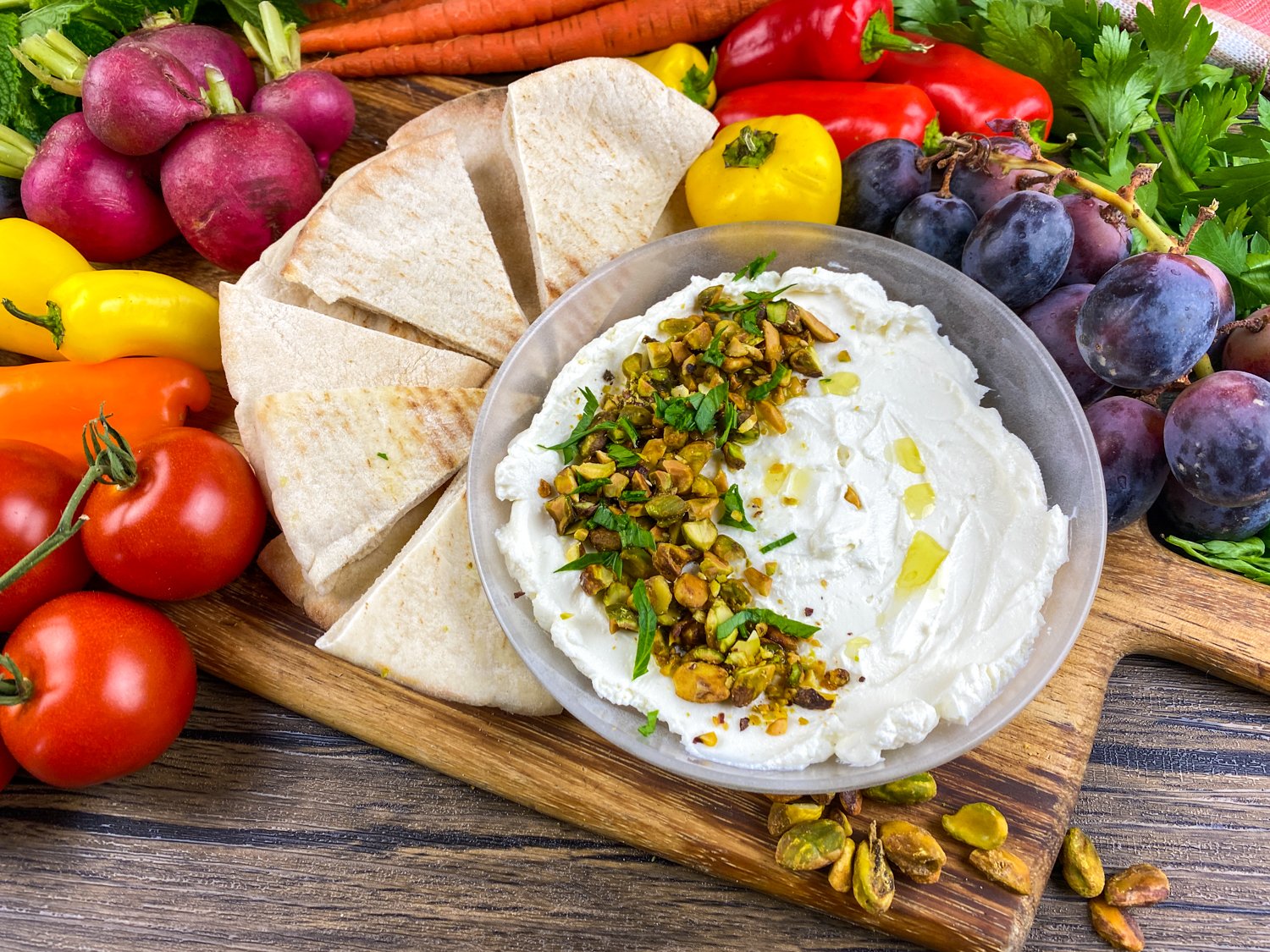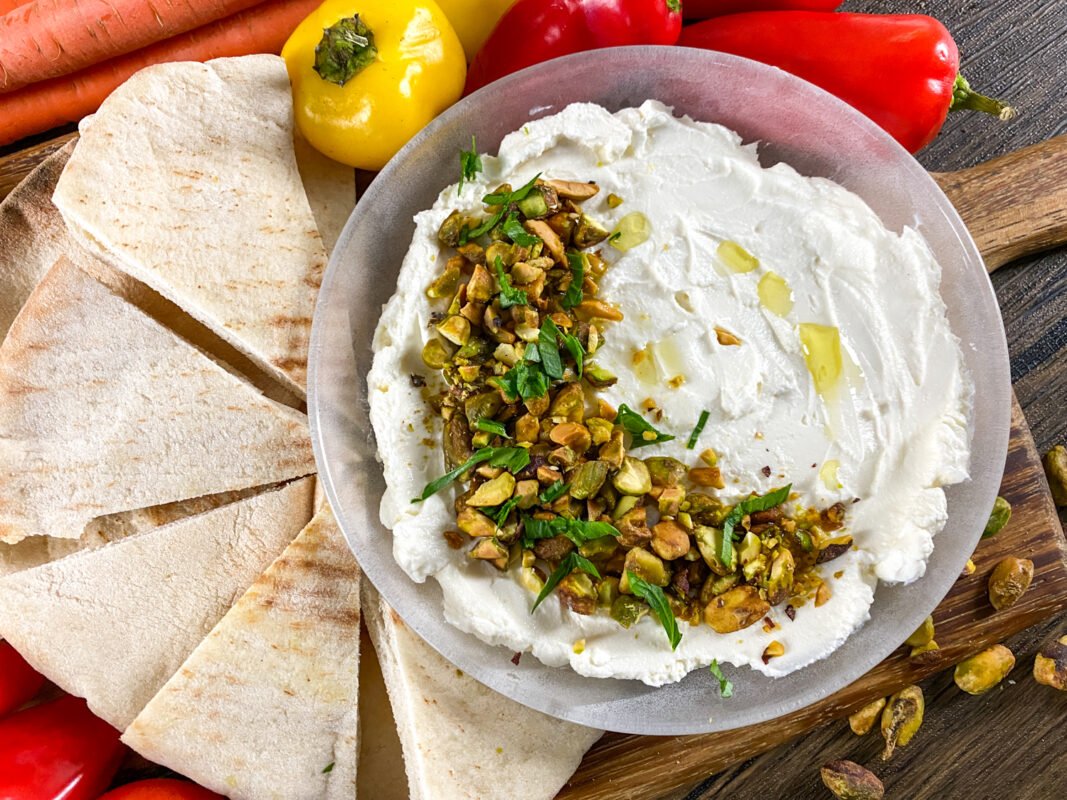- Add the chopped pistachios and sprinkle with the fresh parsley. Serve immediately with an assortment of fresh fruits and vegetables and some pita wedges on the side. Enjoy!