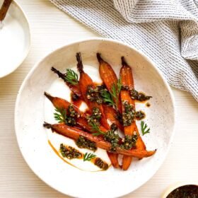 - Dollop the lemony labneh on a plate, top with roasted carrots, and drizzle on the carrot top chimichurri.