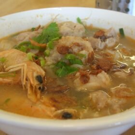 - Ladle the hot broth with chicken and prawns over the noodles.