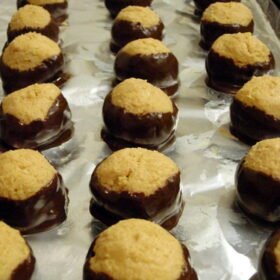 - Using a toothpick or fork, dip each peanut butter ball into the melted chocolate, leaving a small portion uncovered to resemble the buckeye nut. Place back on the parchment paper-lined baking sheet.