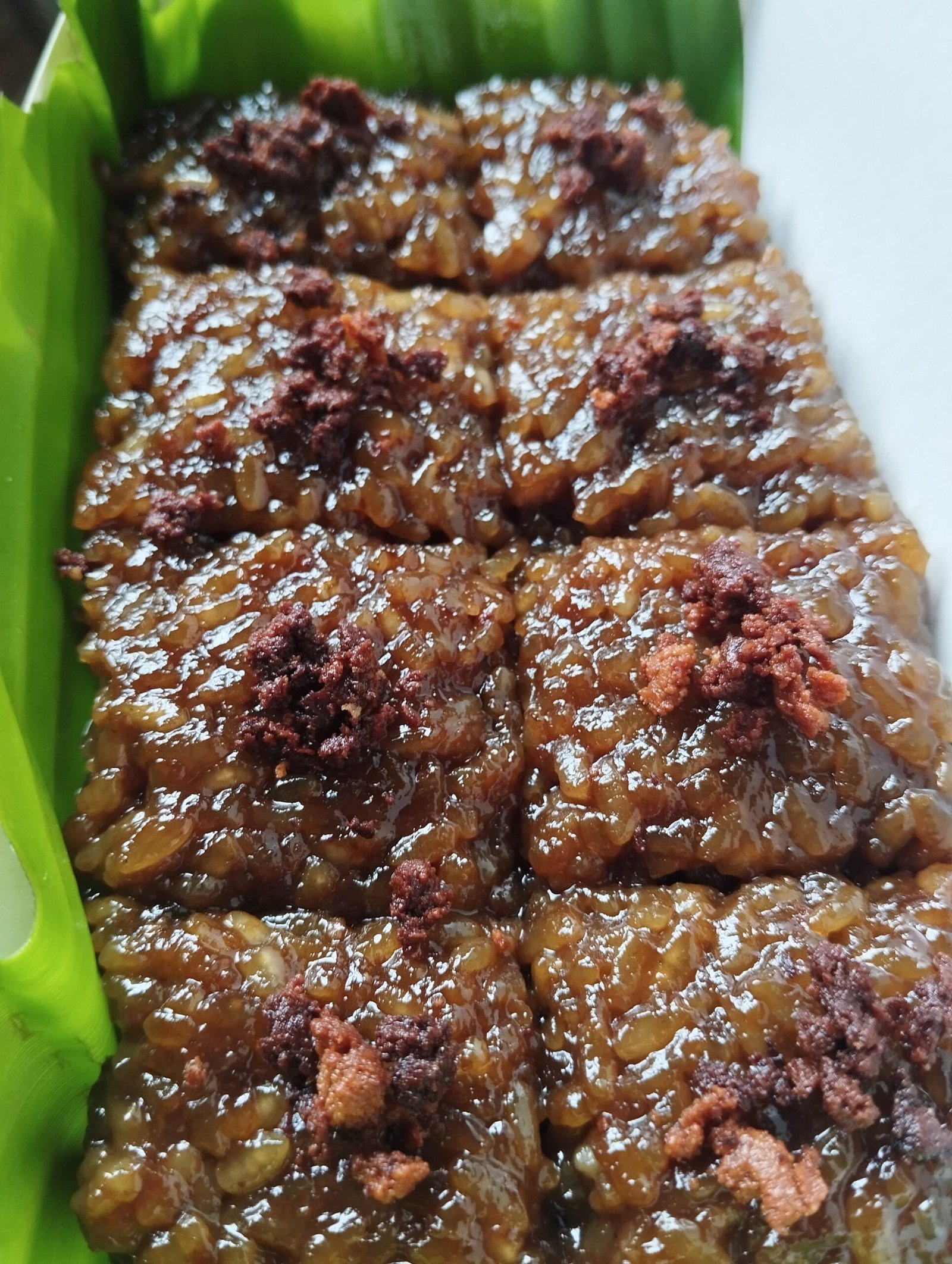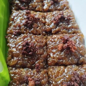 - Pour the Latik topping over the sticky rice, spreading it evenly.