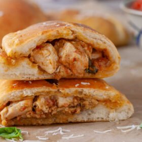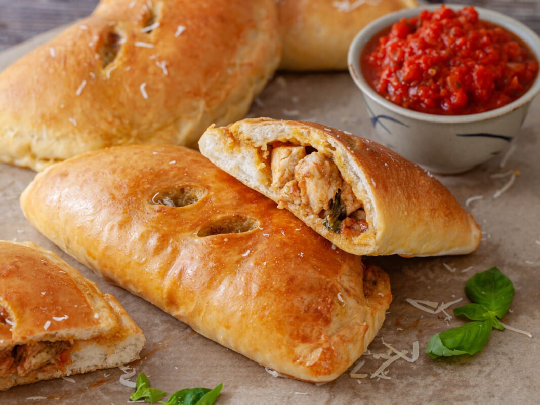 - Arrange the calzones on the prepared baking sheet and brush with the beaten egg.