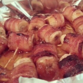 - Wrap each banana chunk with a half slice of bacon and secure with a toothpick.