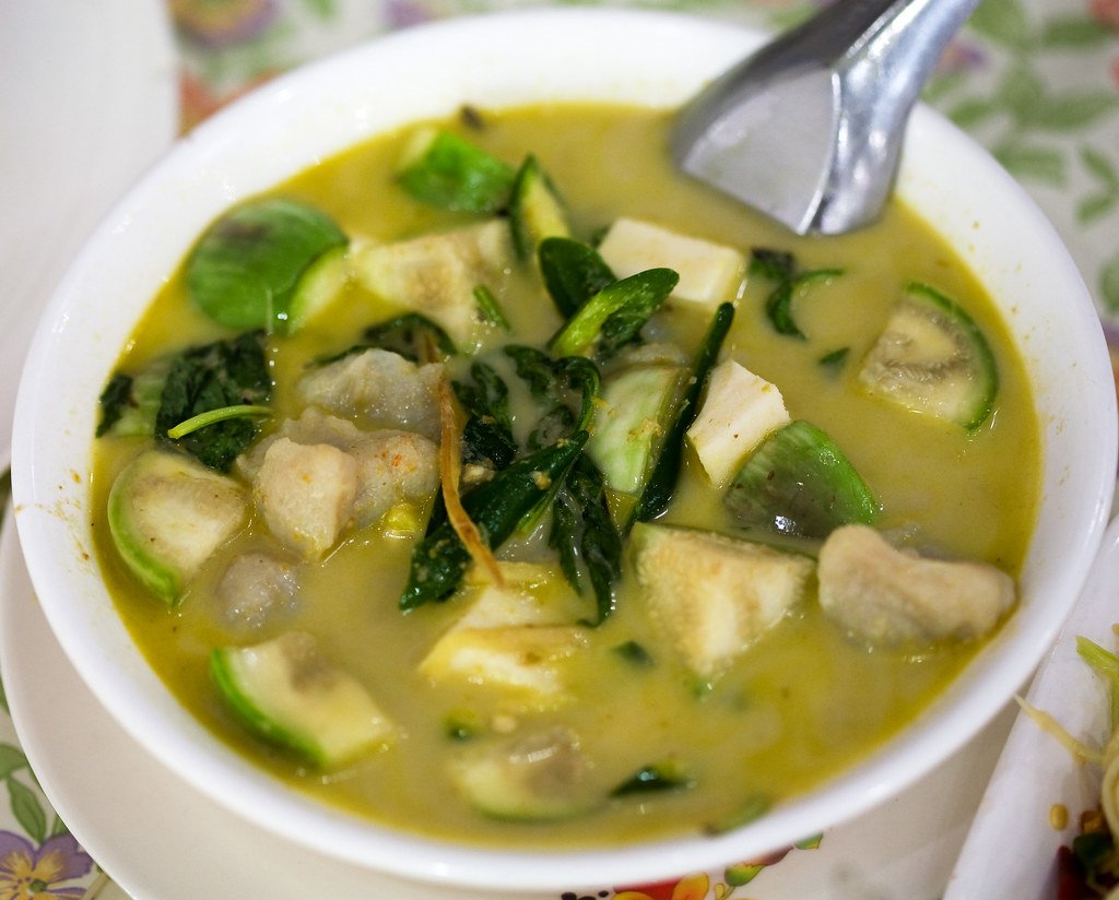 - Serve the Fish balls and eggplant in green curry over cooked rice, garnished with fresh basil leaves.