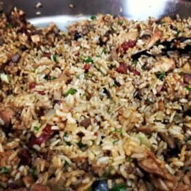 Turkey fried rice with portobello mushroom, Chinese sausage, and turkey innards