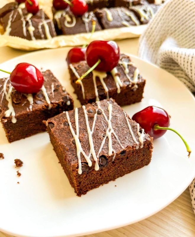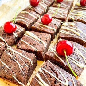 - To serve, drizzle the brownies with melted white chocolate and top with fresh cherries. Slice into squares and enjoy!