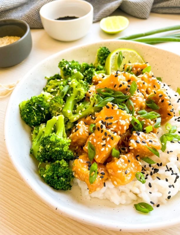 - Serve the tofu and steamed broccoli over cooked rice and top with sesame seeds and scallions.