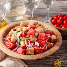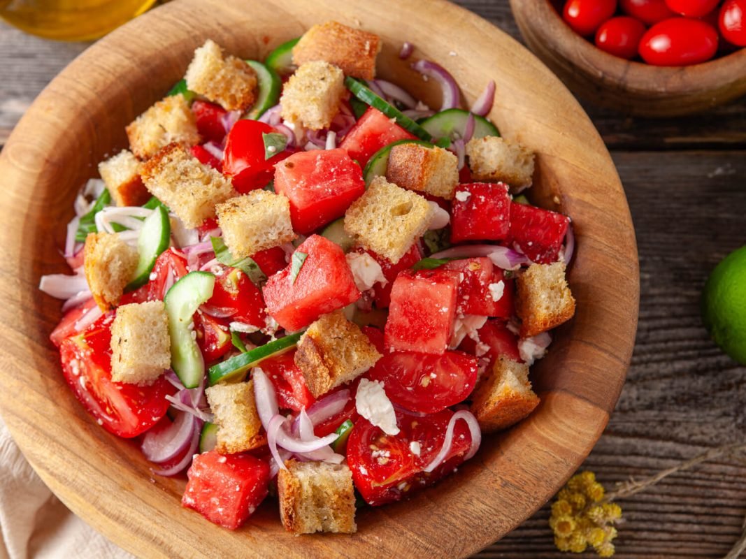 - To serve, tear or cut the toasted bread into bite-sized pieces and add to the salad bowl. Drizzle some of the vinaigrette on top and toss to combine. Transfer to a large serving bowl or platter. Top with the remaining Feta cheese and serve immediately with the remaining dressing on the side. Enjoy!