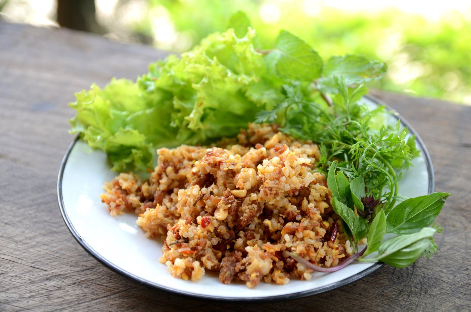 - To serve, place a few lettuce leaves on each plate and top with a generous serving of the Naem khluk mixture.