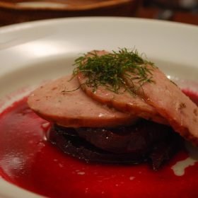 Glazed duckling sausage with pickled roasted beetroot