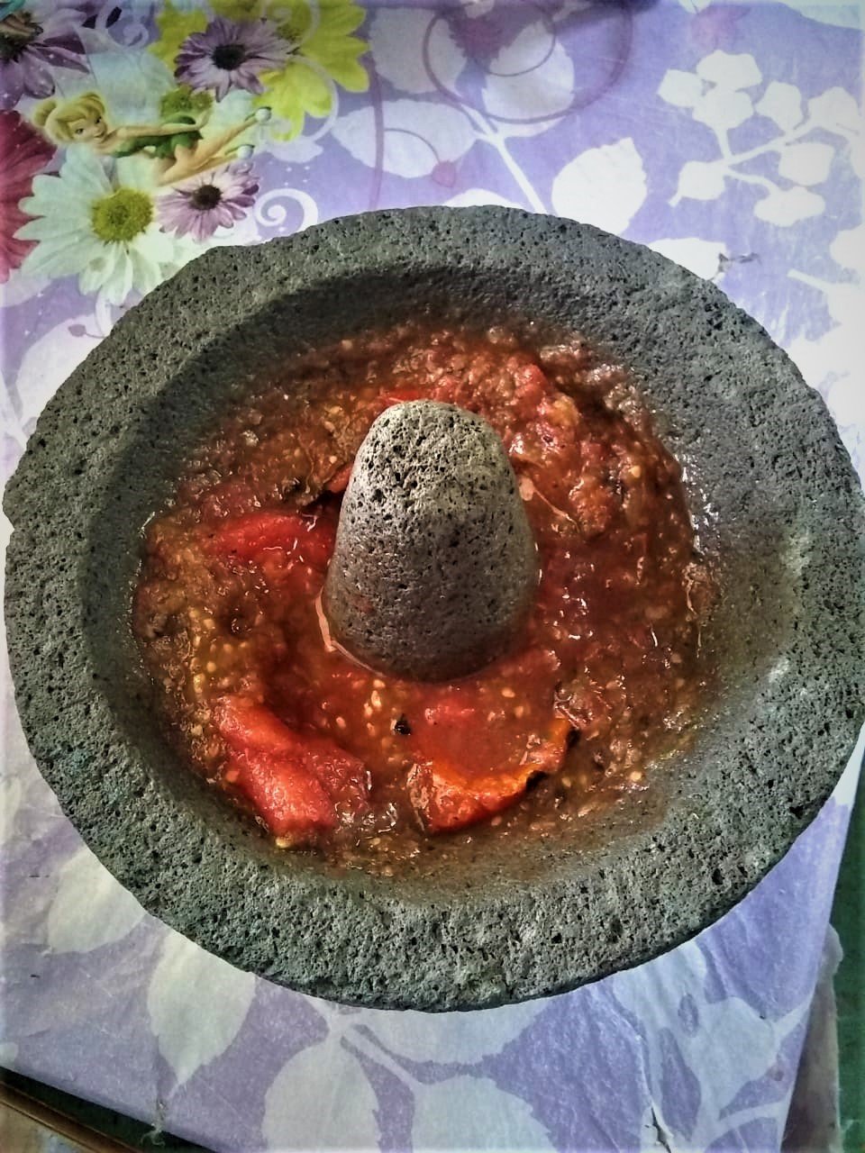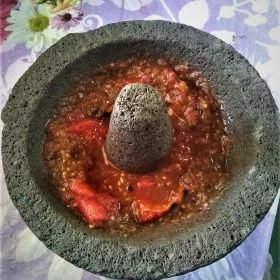- Transfer the roasted tomatoes and jalapeños to the molcajete and grind them into a rough paste using the pestle. You can also use a blender if you don’t have a molcajete.