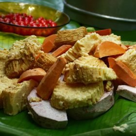 - In a large mixing bowl, combine the chicken, sweet potatoes, taro root, yam, onion, tomatoes, and bell pepper.