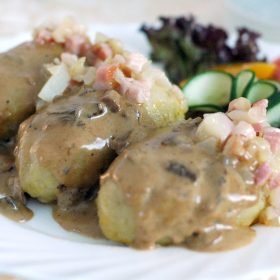 - Remove the Cepelinai with a slotted spoon and serve hot with sour cream and bacon bits on top.