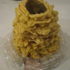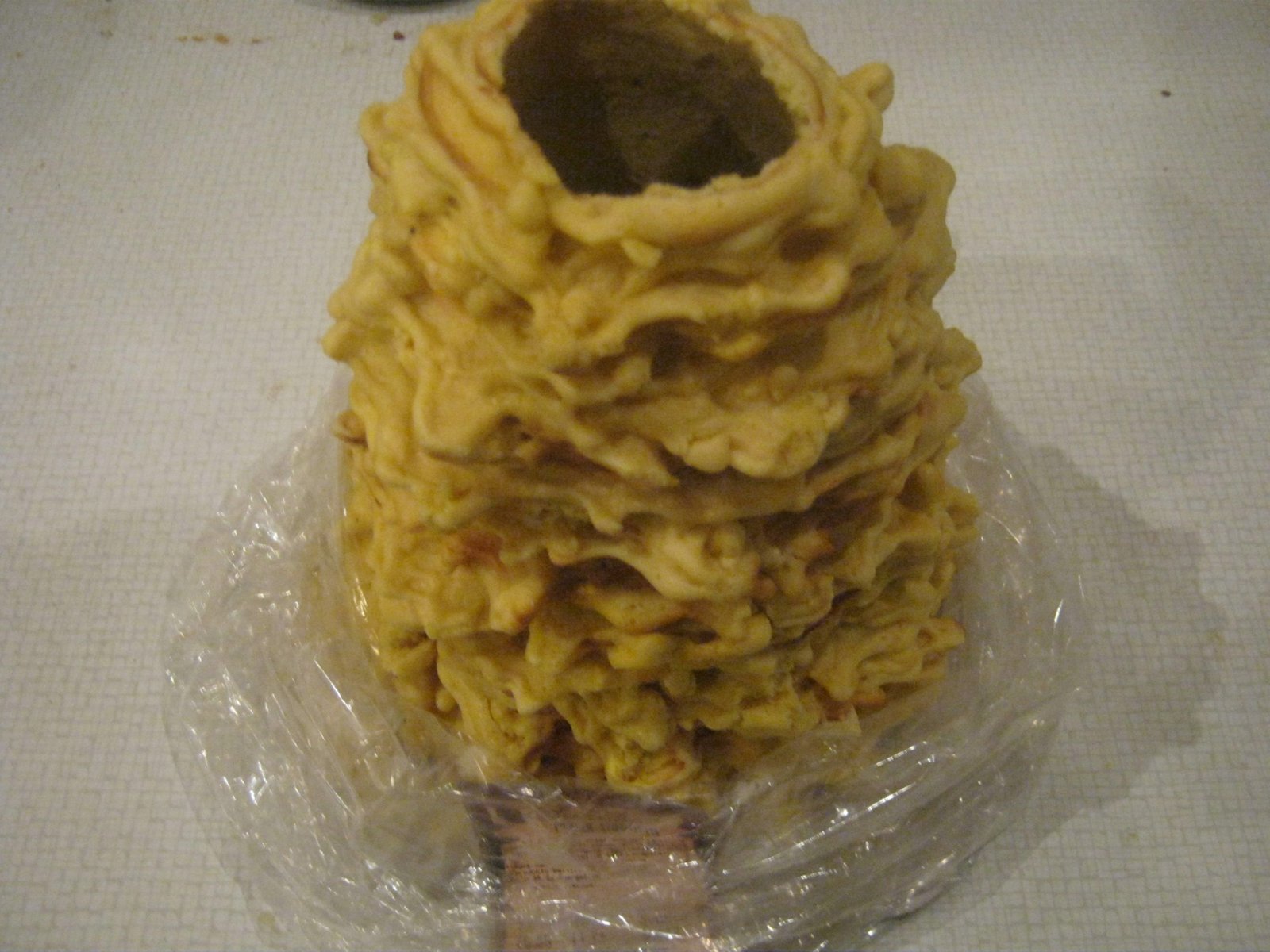 - Repeat the process until all the batter is used up and the Šakotis has formed a tree-like shape.