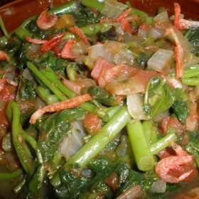 Ravimbomanga sy patsamena is a dish eaten in Madagascar. It consists of potato leaves stewed with dried shrimp and beef in a light tomato sauce and is served over rice