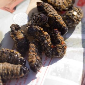 - Add the rehydrated Mopane worms to the skillet and stir-fry for about 5-7 minutes until they start to brown slightly.