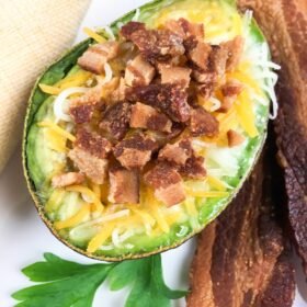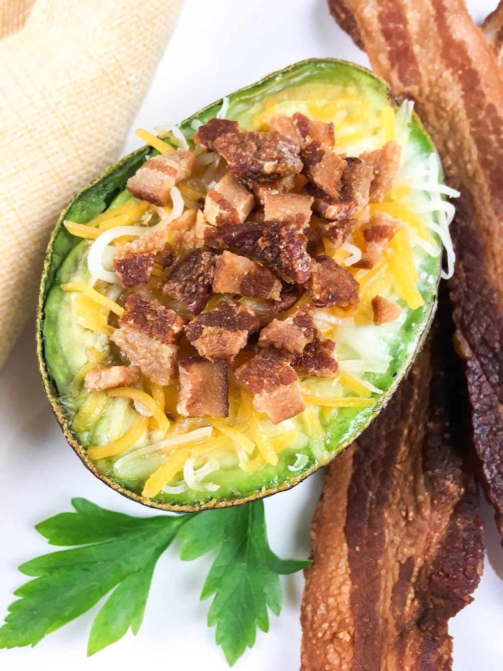 - Remove from oven and top each avocado half with shredded Cheddar Jack cheese and crispy bacon pieces. Garnish with chives or sliced green onions, if desired, and serve immediately. Enjoy!