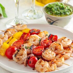• Thread onto skewers, alternating shrimp, tomato, onion, shrimp, tomato, bell pepper, ending with a shrimp. Repeat until all skewers are full.