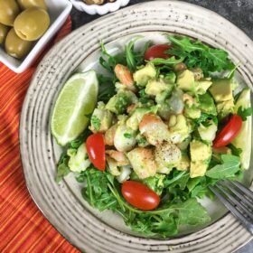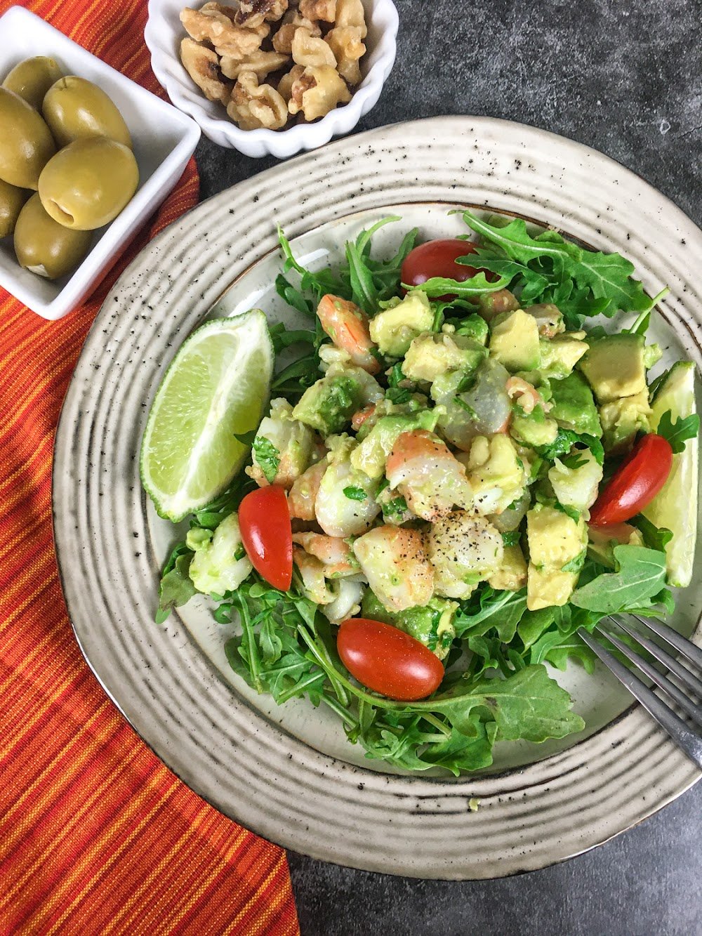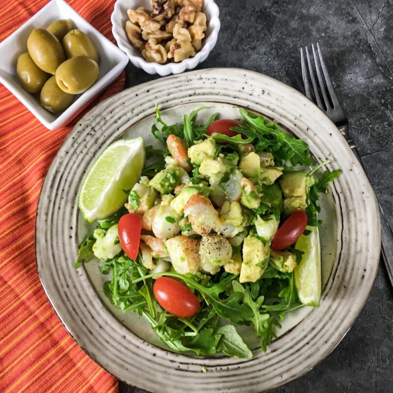- Divide the baby arugula between four meal prep containers or serving plates. Add one-fourth of the avocado shrimp mixture to each container or plate. Evenly divide the green olives, walnuts, and lime wedges between each portion. Serve immediately or refrigerate for later. Enjoy!