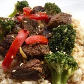 - Serve immediately with cooked brown rice and a drizzle of sauce from the slow cooker. Garnish with some toasted sesame seeds before serving, if desired.