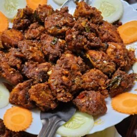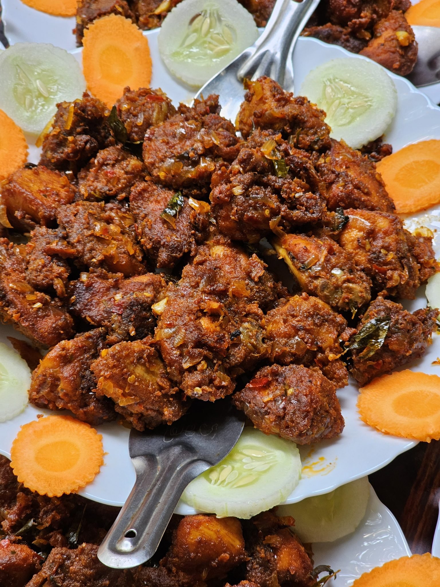 - Add the fried chicken pieces back to the pan and toss them with the curry leaves for a minute to enhance the flavor.