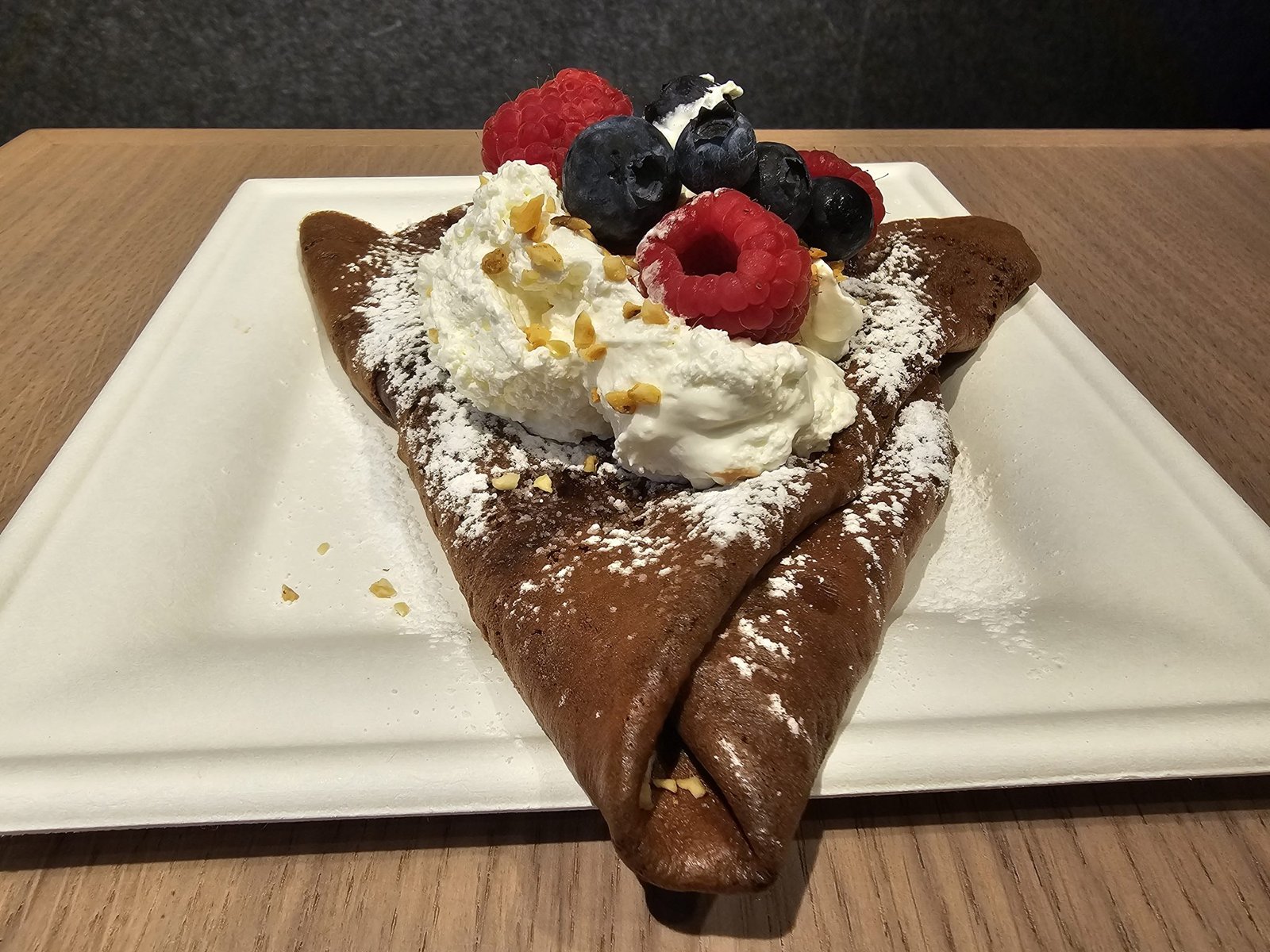 Chocolate crepe triangle topped with whipped cream, berries, powdered sugar, and chopped nuts