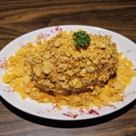 Hasselback Potato Chicken coated in crushed cornflakes