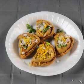 - Remove the fried ghughras and place them on a paper towel to drain excess oil.