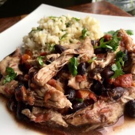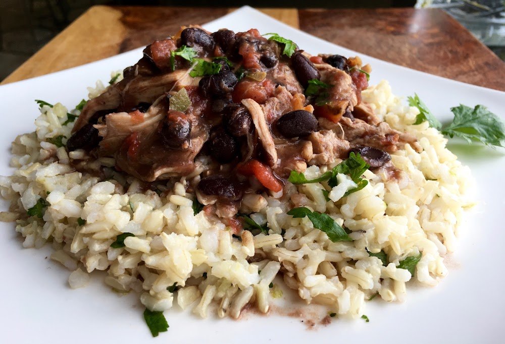- To serve, spoon chicken mixture over plain brown rice or cilantro-lime rice. Top with cilantro-lime sauce if desired. Serve with remaining lime wedges. Enjoy!