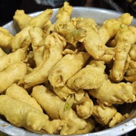 - Dip each green chili in the batter, ensuring it is coated well. Carefully drop the coated chilies into the hot oil.