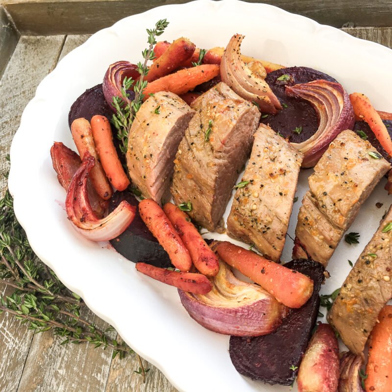 - Toss the beets, carrots, and red onion with the remaining olive oil and thyme leaves. Season with salt and black pepper, to taste, and spread the seasoned veggies around the pork tenderloin in a uniform layer without overcrowding.