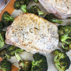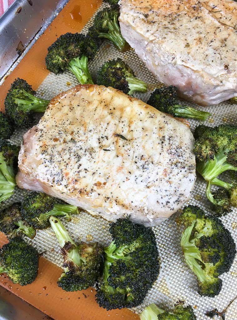 • Remove sheet pan from oven and transfer pork chops and broccoli to a serving platter. Cover loosely and allow pork chops to rest for 5-10 minutes before serving. Enjoy!