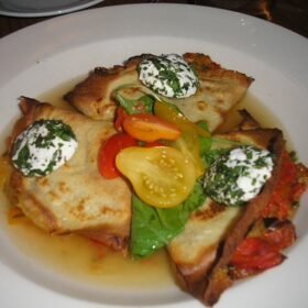 - To assemble, place a spoonful of Ratatouille on each crepe and roll it up. Serve the crepes with a drizzle of Lemon Broth, a dollop of Herbed Goat Cheese, and a side of Arugula Salad.