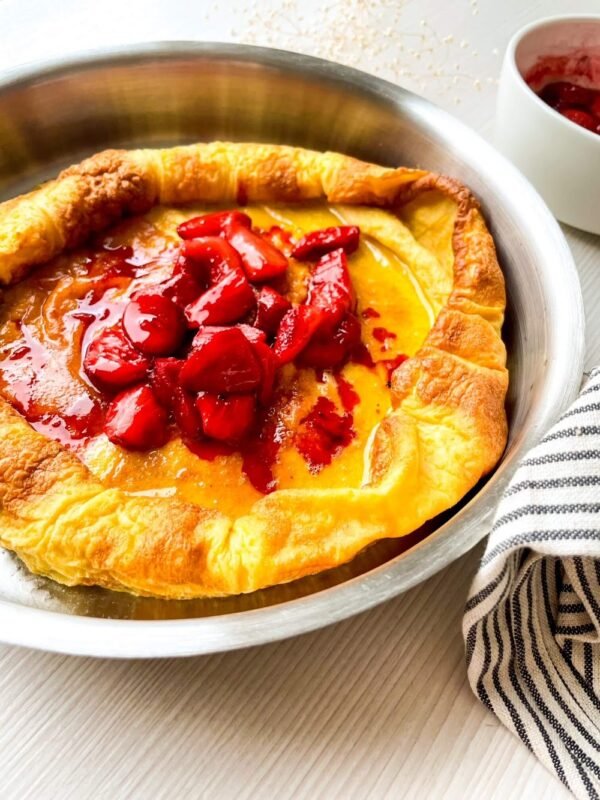 - In the last 5 minutes while the strawberries are roasting, place an oven-safe skillet in the oven to heat.