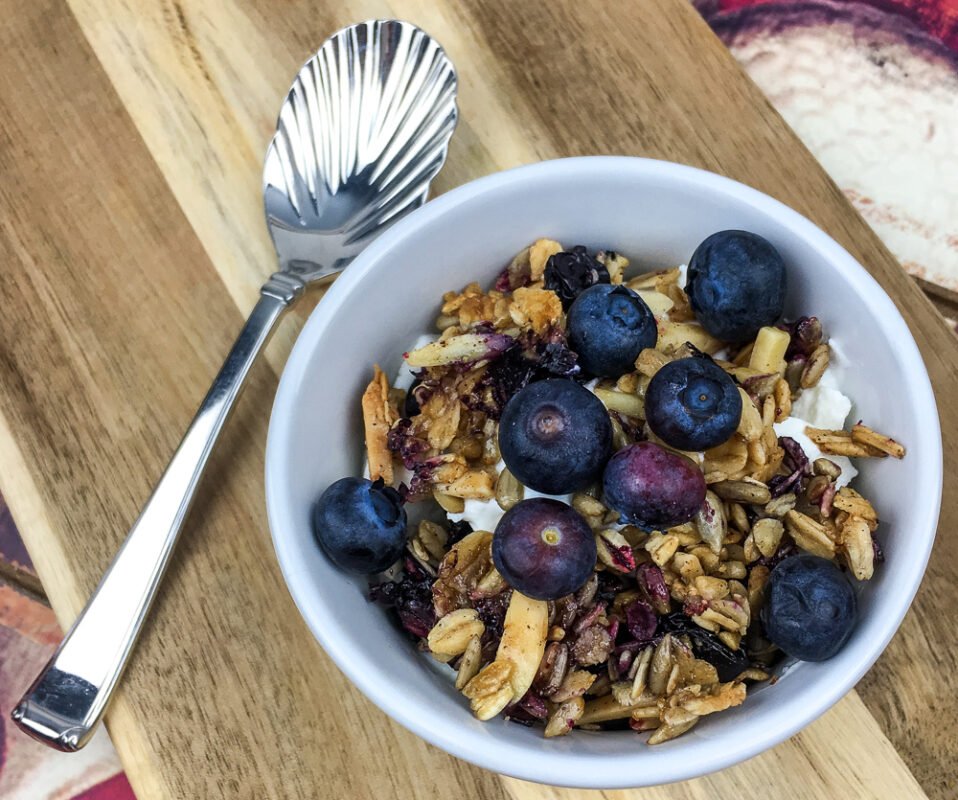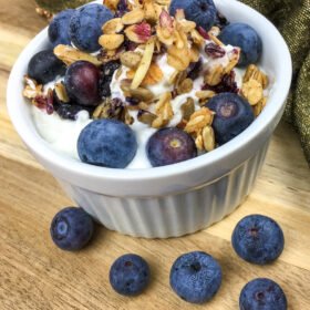 - Remove from oven and cool completely. The granola will become nice and crispy as it cools. Once cooled, serve with Greek yogurt and the remaining fresh blueberries. Enjoy!
