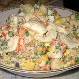 Olivier salad, also known as Russian salad, is a popular dish made with diced vegetables, potatoes, and sometimes meat, all bound together with mayonnaise. It’s a delicious and hearty salad that is often served as a side dish at parties or holiday gatherings.
