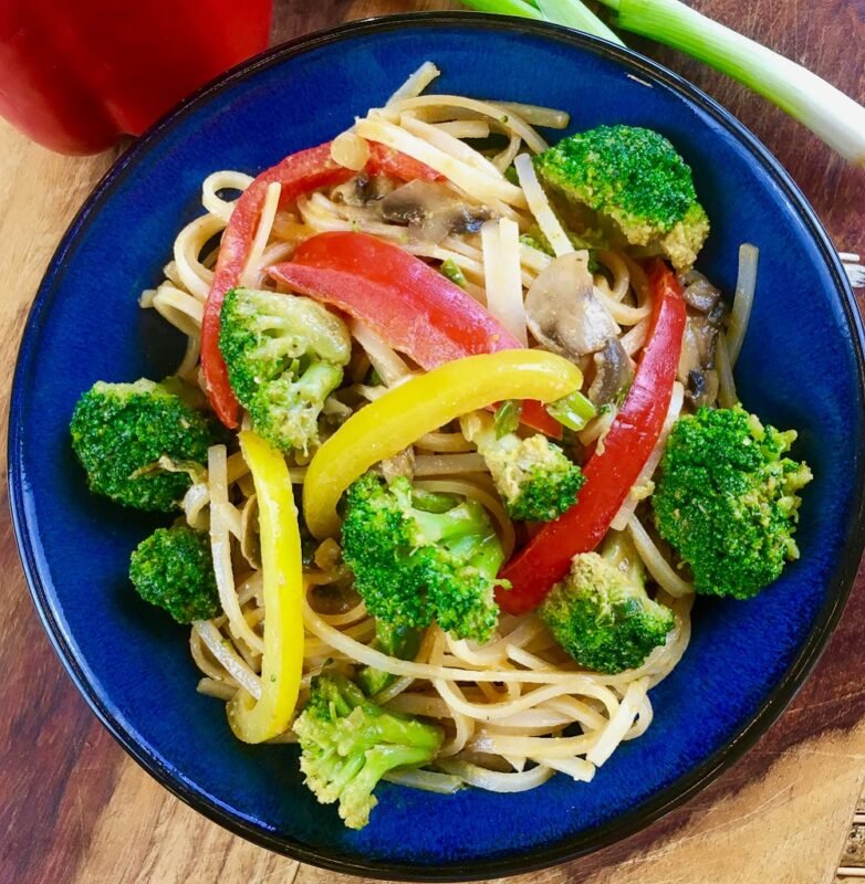 Spicy Peanut Rice Noodles with Broccoli and Peppers