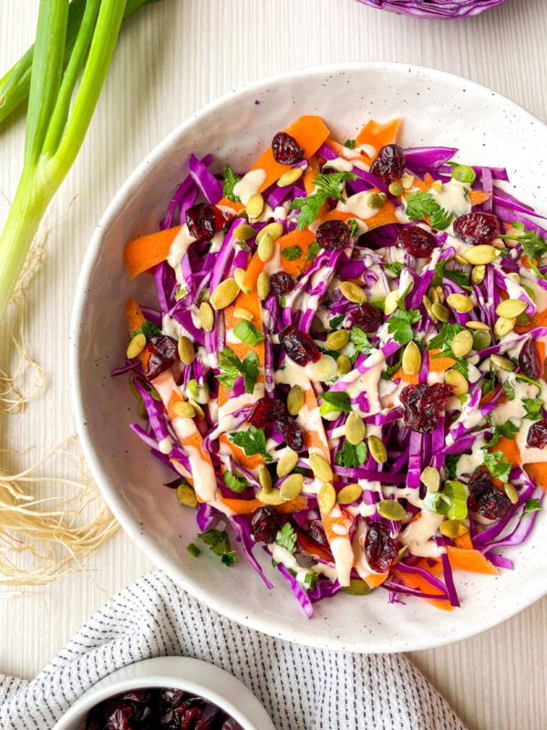 Red Cabbage and Carrot Salad with Lemon Tahini Dressing is a delicious and nutritious dish made with fresh red cabbage, grated carrots, and a tangy lemon tahini dressing. It’s a vibrant and colorful salad that’s packed with flavor and healthy ingredients.